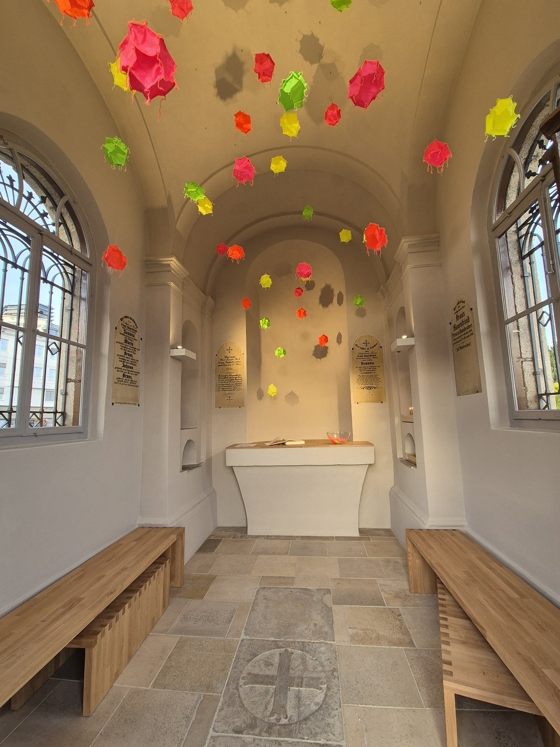 Die von Elisabeth Altenburg geschaffene Kunstinstallation besteht aus dreidimensionalen textilen Objekten in vier leuchtenden Farben, die von der Decke herabhängen. Dazu kommen Bänke, die zum Verweilen einladen. Kerzen können entzündet werden, ein Gedenkbuch liegt auf. Das Rauminnere der 1835 geweihten Kapelle wurde zuvor generalsaniert, nachdem es jahrelang nicht öffentlich zugänglich war.