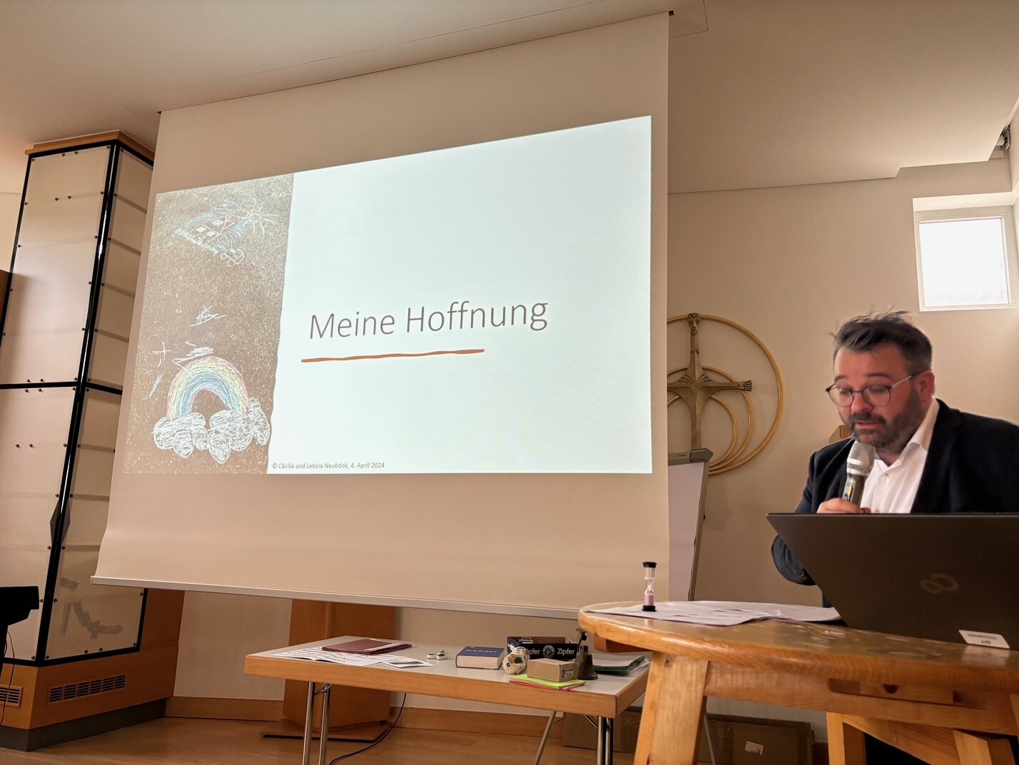 Seinen Impuls schloss Daniel Neubäck mit diesem Hoffnungsbild ab: Den Straßenkreide-Zeichnungen seiner Töchter.