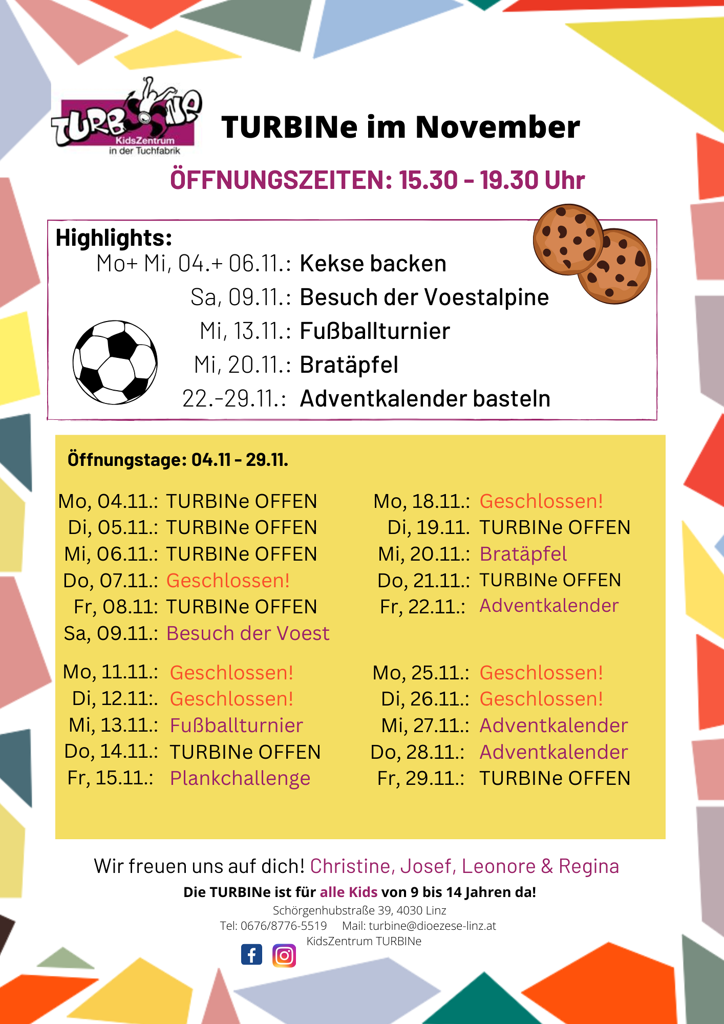 Wir beginnen am 4. und 6.11. mit einem kulinarischen Highlight und backen mit euch Kekse. Am 9.11. begleiten wir euch in das Ausbildungszentrum der Voestalpine. Am 13.11. könnt ihr eure fußballerischen Qualitäten unter Beweis stellen. Bratäpfel gibt's am 20.11. Von 22.-29.11. wird es vorweihnachtlich beim Basteln unseres Adventkalenders.