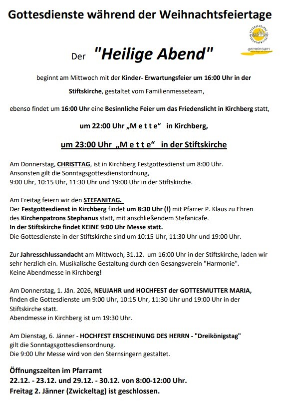 Am Donnerstag, 1. Jän. 2026, NEUJAHR und HOCHFEST der GOTTESMUTTER MARIA, finden die Gottesdienste um 9:00 Uhr, 10:15 Uhr, 11:30 Uhr und 19:00 Uhr in der Stiftskirche statt. Abendmesse in Kirchberg ist um 19:30 Uhr.