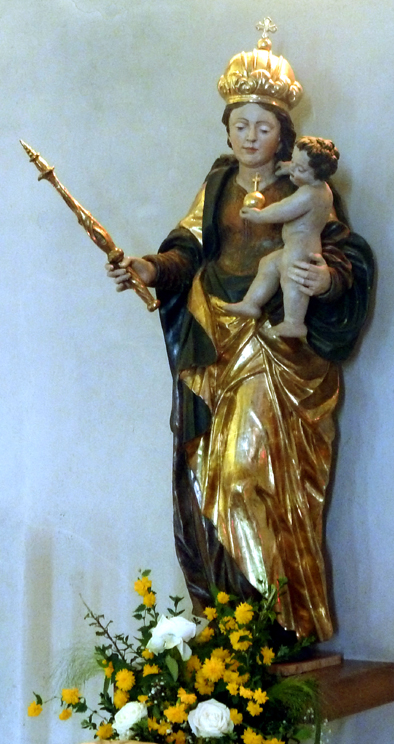 Typus der gekrönten Maria mit Zepter und Kind, von der Mariensäule München (um 1600) abzuleiten. Figur der Werkstätte Bonaventura Schwanthaler nahe stehend.