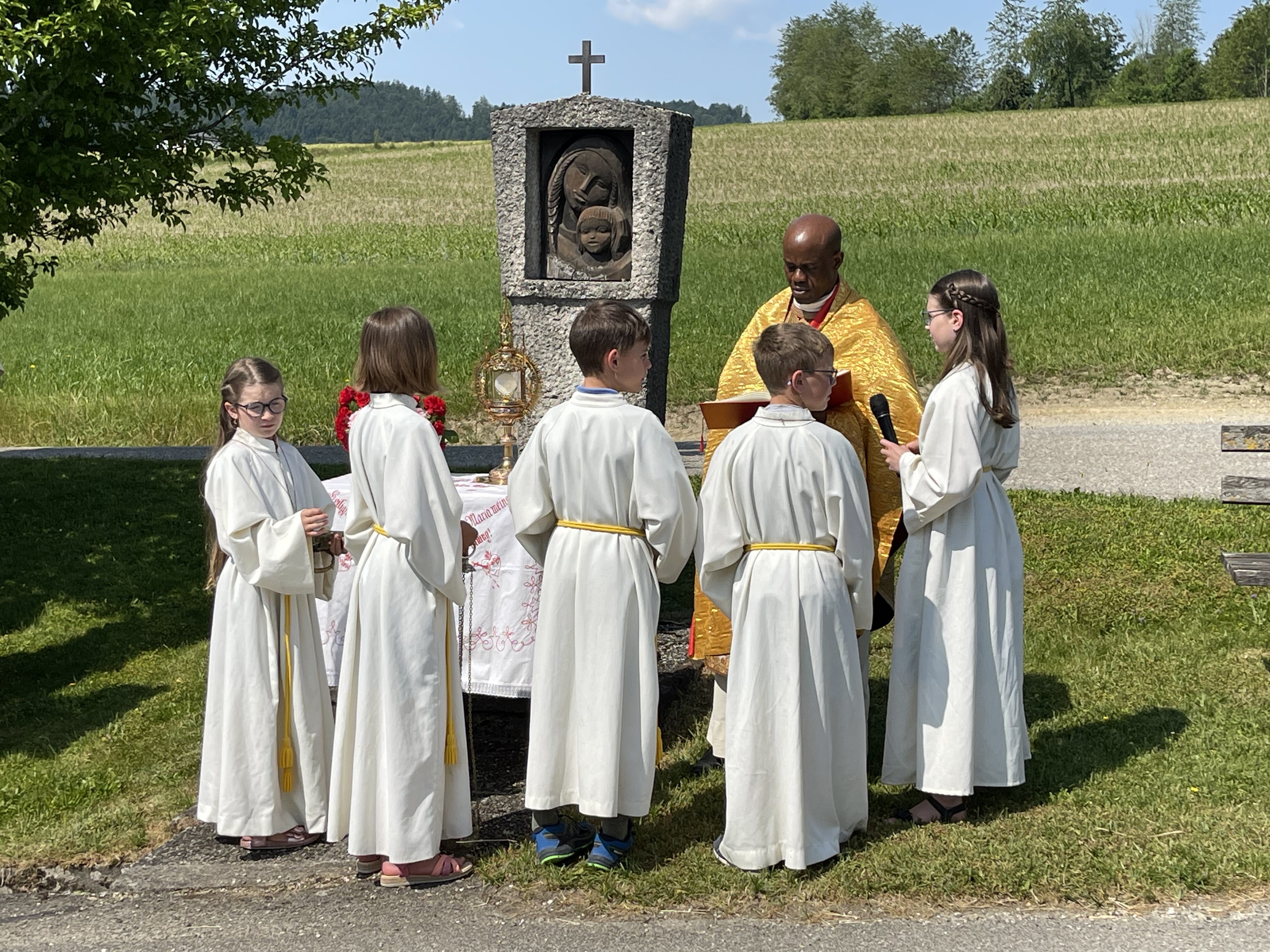 Fronleichnam und Herz Jesu (Patrozinium) - zwei besondere Feste in unserer Kirchengemeinde: nach den feierlichen Gottesdiensten mit P. Andreas Holl zu Fronleichnam bzw. Pfarrer Christian Ojene zum Patrozinium fanden auch wieder Prozessionen statt, begleitet von den Ministranten, den Vereinen, dem Kirchenchor, der Pfarrbevölkerung und der Musikkapelle. In Dankbarkeit und Freude tragen wir "Christus" im Allerheiligsten durch unser Dorf und bitten um Schutz und Segen für unseren Ort, unser Land, unsere Familien und unsere Pfarre.