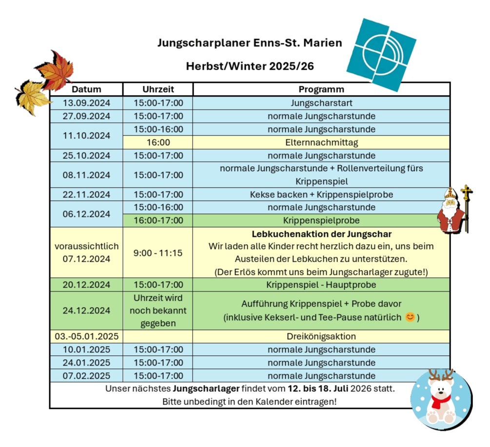 Themenstunden, - abende,- übernachtungen (z.B. Afrikastunde, Herbergssuchen, Kinderyoga, gruppendynamische Spielstunden, Theater spielen,…), Spielen, Basteln, Singen, JS/Mini-Start, JS/Mini Aufnahme, Krippenspiel Kindermette, Sternsingeraktion, JS/Mini Elternabend, Pfarrcafes, Ostergrußaktion, Lagersendungsmesse, JS/Mini-Lager, Teilnahme an Dekantsveranstaltungen, Nikolausaktion.....