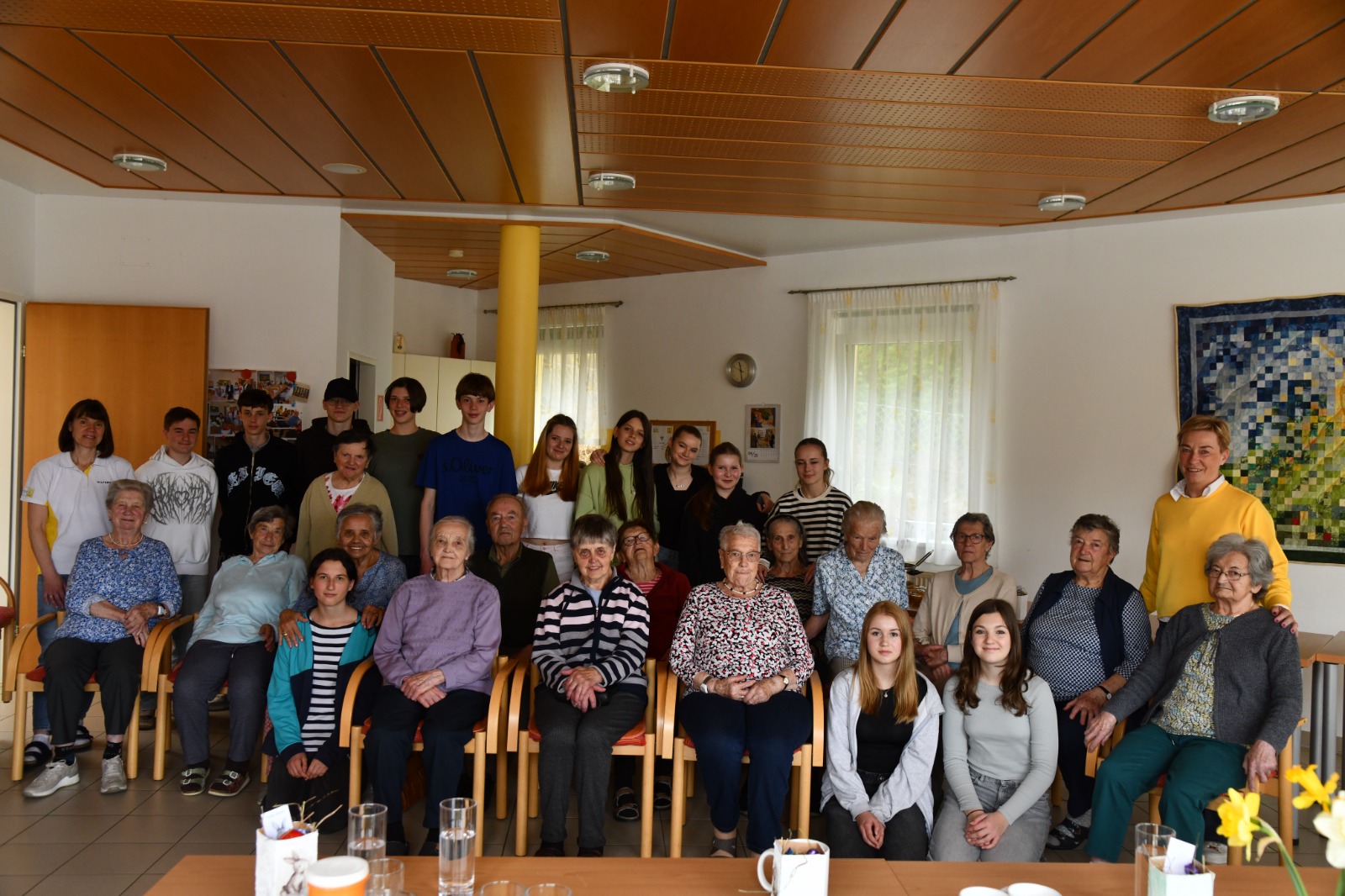 Mit ihrer Firmhelferin Sophie Ganglberger besuchten in der Karwoche am Dienstag, 15. April 2025 13 Firmlinge die Senioren in der beliebten Einrichtung des Ortes, die im Lebenshaus untergebracht ist.