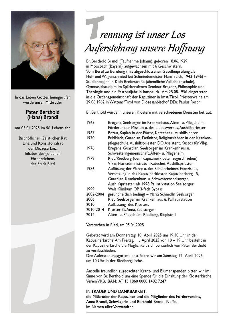 Pater Berthold war Kapuziner mit Leib und Seele und hat Jahrzehnte lang segensreich in Ried in der Riedbergpfarre und im Kapuzinerkloster der Stadtpfarre gewirkt.