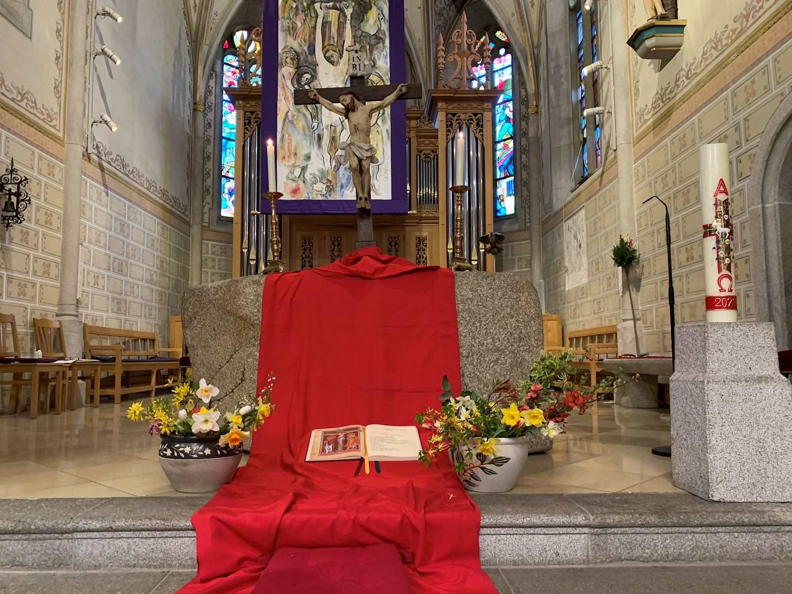 Die vor dem Kreuz abgelegten Blumen fanden sich im österlichen Blumenschmuck in unserer Kirche wieder.
