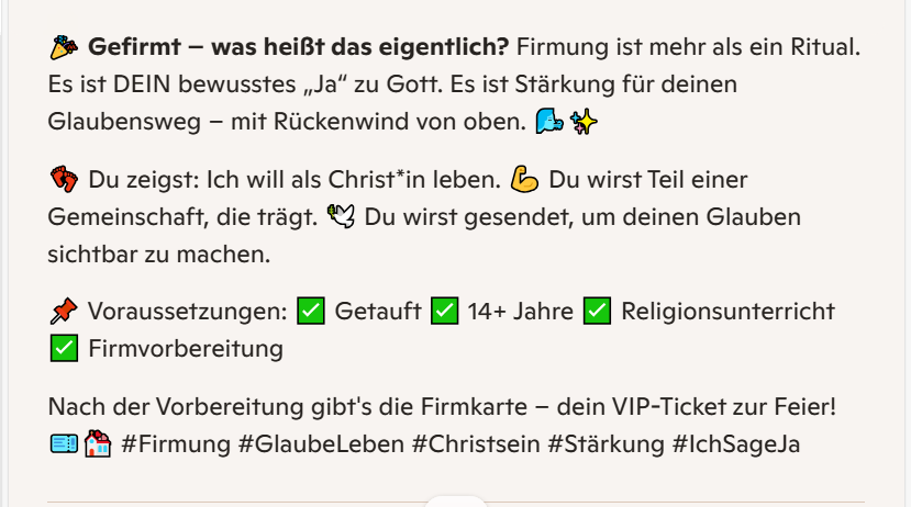 Firmung ist Bestätigung dessen, was in der Taufe begonnen und in der Kommunion verstärkt und verbunden hat: der Glaube an Gott, an seine Kraft und Liebe, die uns begleitet und zu der wir bewusst und mit Freude JA sagen.