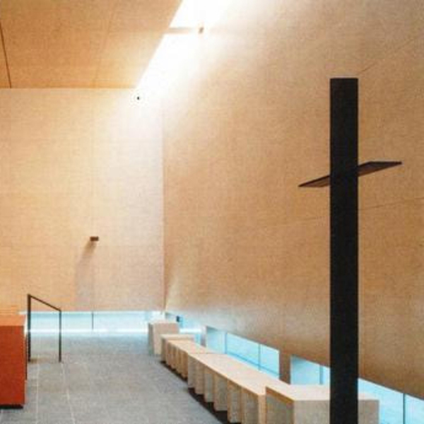 Eine schmale Oberlichte lässt das Licht auf die Altarwand herabfluten, durch ein Lichtband am Boden der Nord- und Westseite des Raumes wirkt der Raum wie schwebend. Durch die Glasfenster des Gartens im Innenhof fällt das Licht in der Mittagszeit direkt in den Bereich des Kreuzganges. Die Morgensonne taucht den Raum vom Osten her in ein flimmerndes Licht, das durch die Wellen des Wasserbeckens gebrochen wird.