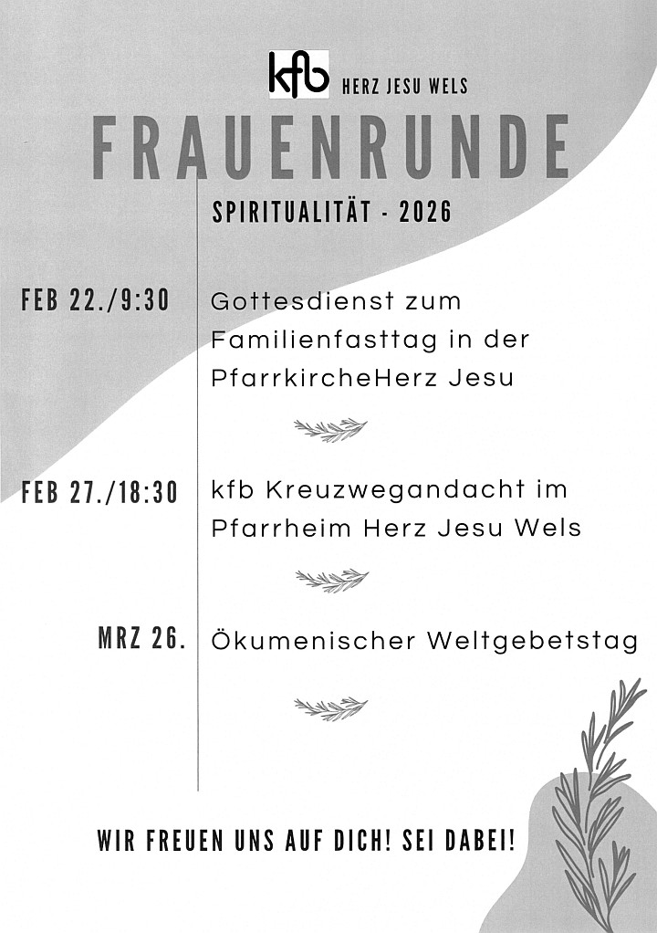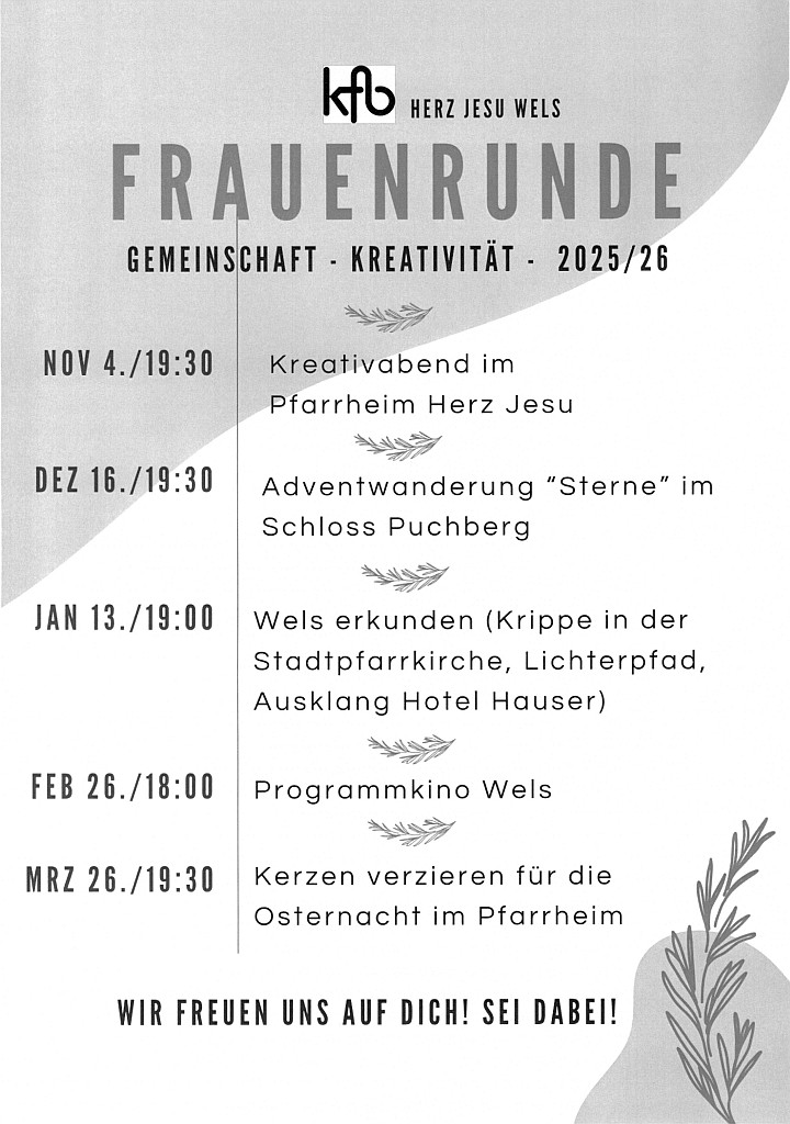 Unser Treffpunkt ist – soweit nicht anders angegeben – das Pfarrheim, Flotzingerplatz 5 (1. Stock).