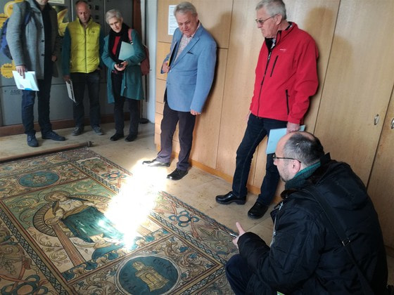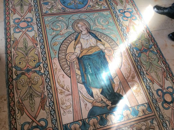 Der bedruckte Stoff im Format 300x160 cm stammt aus der Zeit um 1900. Die Jalousie wurde über die weißen Fenster gehängt und wirkte bei durchscheinendem Licht wie ein Buntglasfenster. Das diözesane Kunstreferat merkt an: "Seltenes Stück!" Das Motiv zeigt die Mondsichelmadonna mit einem Lobpreis der Lauretanischen Litanei: Porta Coeli - Tor zum Himmel.
