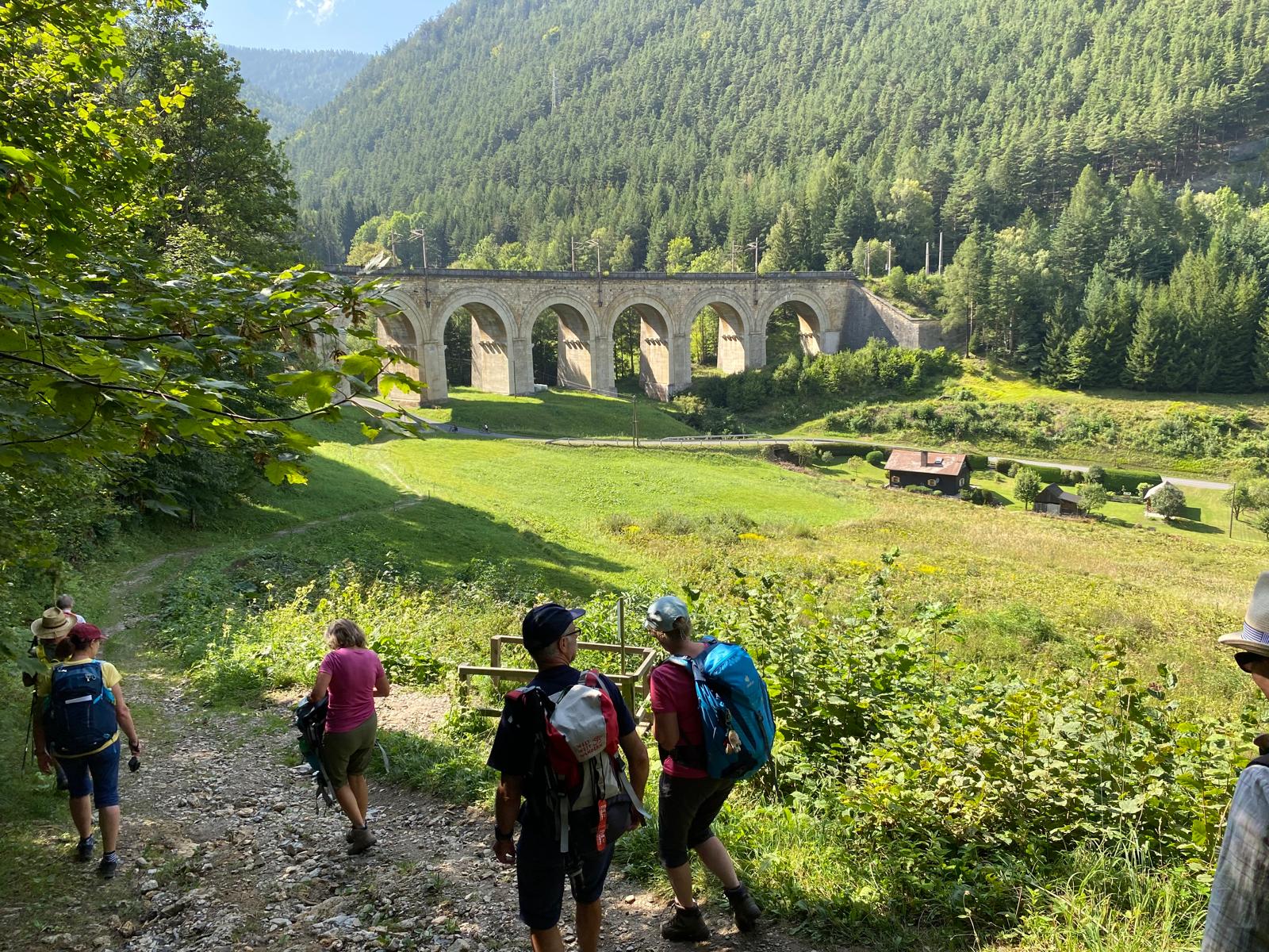 Wir gingen los auf dem so genannten Bahnwanderweg entlang der beeindruckenden Bahnstrecke in Richtung Breitenstein. Dieses historische Bahnbauwerk weist zahlreiche spektakuläre Brücken und Viadukte auf und ist ein einzigartiges Meisterwerk der (damaligen) Technik. Diese Bahn wurde 1854 nach einer nur sechsjährigen Bauzeit als erste Gebirgsbahn der Welt eröffnet. Geplant wurde sie von Carl Ritter von Ghega und am Bau waren rund 20 000 Arbeiter*innen beteiligt! Inzwischen wurde die Semmeringbahn zum Unesco-Weltkulturerbe erklärt!