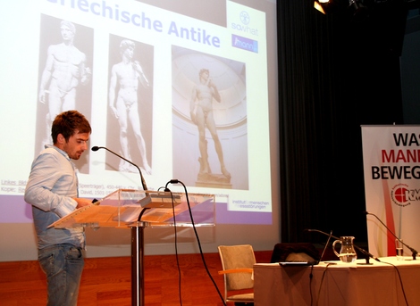 Auf abwechslungsreiche Art zeigte er auf, dass die Wurzeln des traditionellen Männerbildes – stark, zielstrebig, leistungs- und konkurrenzorientiert, tapfer, machtbewusst usw. - bereits in der Antike grundgelegt sind. Gleichzeitig verwies er darauf, dass mit der Militarisierung des männlichen Körpers im 18. und 19. Jahrhundert eine Übersteigerung dieses antiken Konzeptes vom idealen Mann einher ging, die ihren Gipfel und Pervertierung in den völlig unrealistischen Vorstellungen des NS-Mannes fand.
