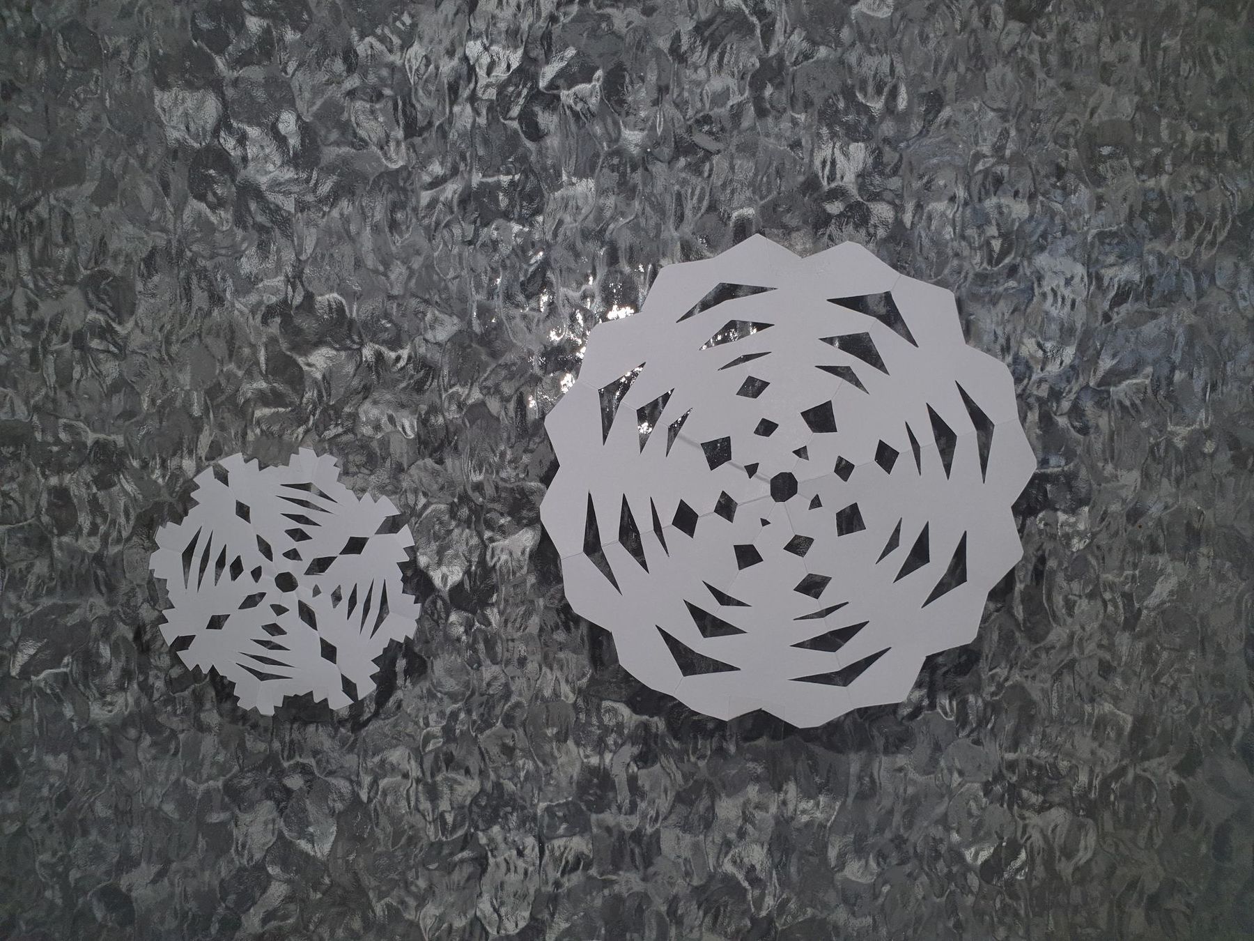 Jetzt kannst du deine Schneeflocken mit vier kleinen durchsichtigen Klebestreifen zum Beispiel am Fenster befestigen (oder am Kleiderkasten, oder an der Haustüre, …) (Bild 13)