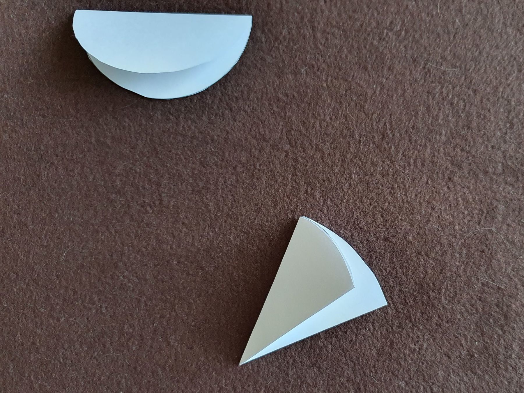 Falte den Kreis einmal in der Mitte (Bild 04). Falte den Halbkreis noch 2x jeweils in der Mitte. (Bilder 05 und 06)