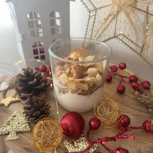 Zum Servieren zunächst die Creme in Gläser geben, dann das Bratapfelkompott darauf verteilen, etwas von den fein zerbröselten und