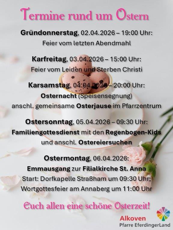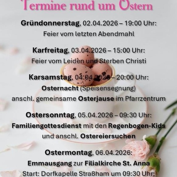 In diesen besonderen Tagen wollen wir den Weg Jesu vom letzten Abendmahl über Leiden und Sterben bis hin zur Freude der Auferstehung gemeinsam gehen. Wir freuen uns, wenn viele Kinder, Familien und Pfarrangehörige mitfeiern und bei den Gottesdiensten sowie den anschließenden Begegnungen Gemeinschaft erleben.