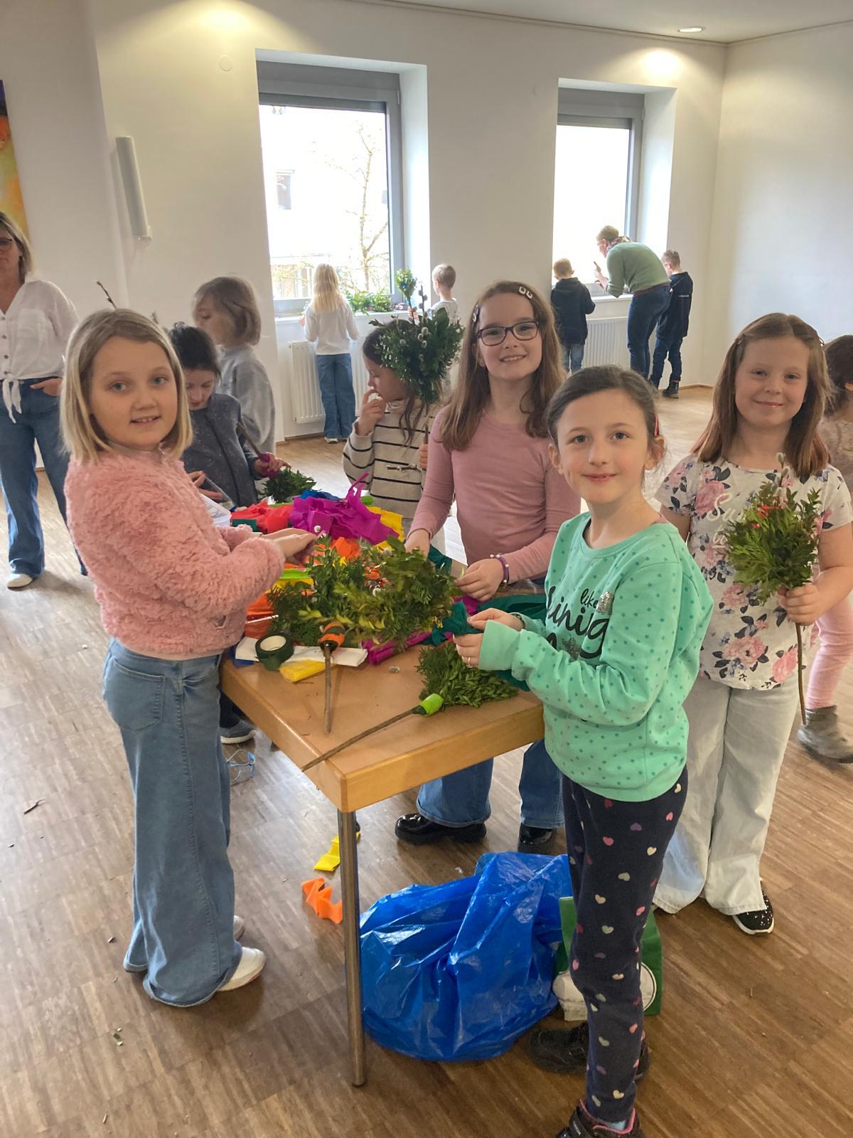 Mit ihren selbst gebundenen Palmbuschen bereiten sich die Kinder nun auf die Karwoche und das Osterfest vor.