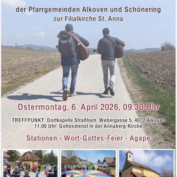 Die Pfarrgemeinden Alkoven und Schönering laden am Ostermontag, 6. April 2026, herzlich zum gemeinsamen Emmaus-Gang zur Filialkirche St. Anna ein.