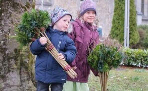 Mit einem Familiengottesdienst startete die Pfarrgemeinde Traun am Palmsonntag in die Karwoche 2026. Die mitgebrachten Palmbuschen wurden am Kirchenvorplatz gesegnet.
