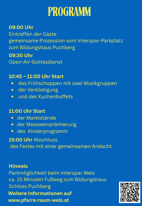 Am 31. Mai 2026 um 9:30 Uhr wird im Schloss Puchberg eine „Open air" Eucharistie gefeiert. An vielen Ständen wird man witzige Einblicke in das kirchliche Leben bekommen, es können z.B. Messweine aus allen Pfarrgemeinden verkostet werden. Für das leibliche Wohl ist natürlich gesorgt.