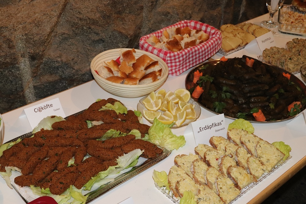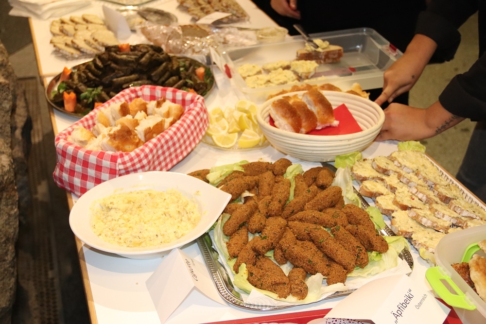 SchülerInnen und Eltern der Neuen Mittelschule Schärding boten in der Pause Kostproben aus ihrem internationalen Kochbuch an. Köstlichkeiten aus Fairem Handel gab es vom Weltladen Schärding.