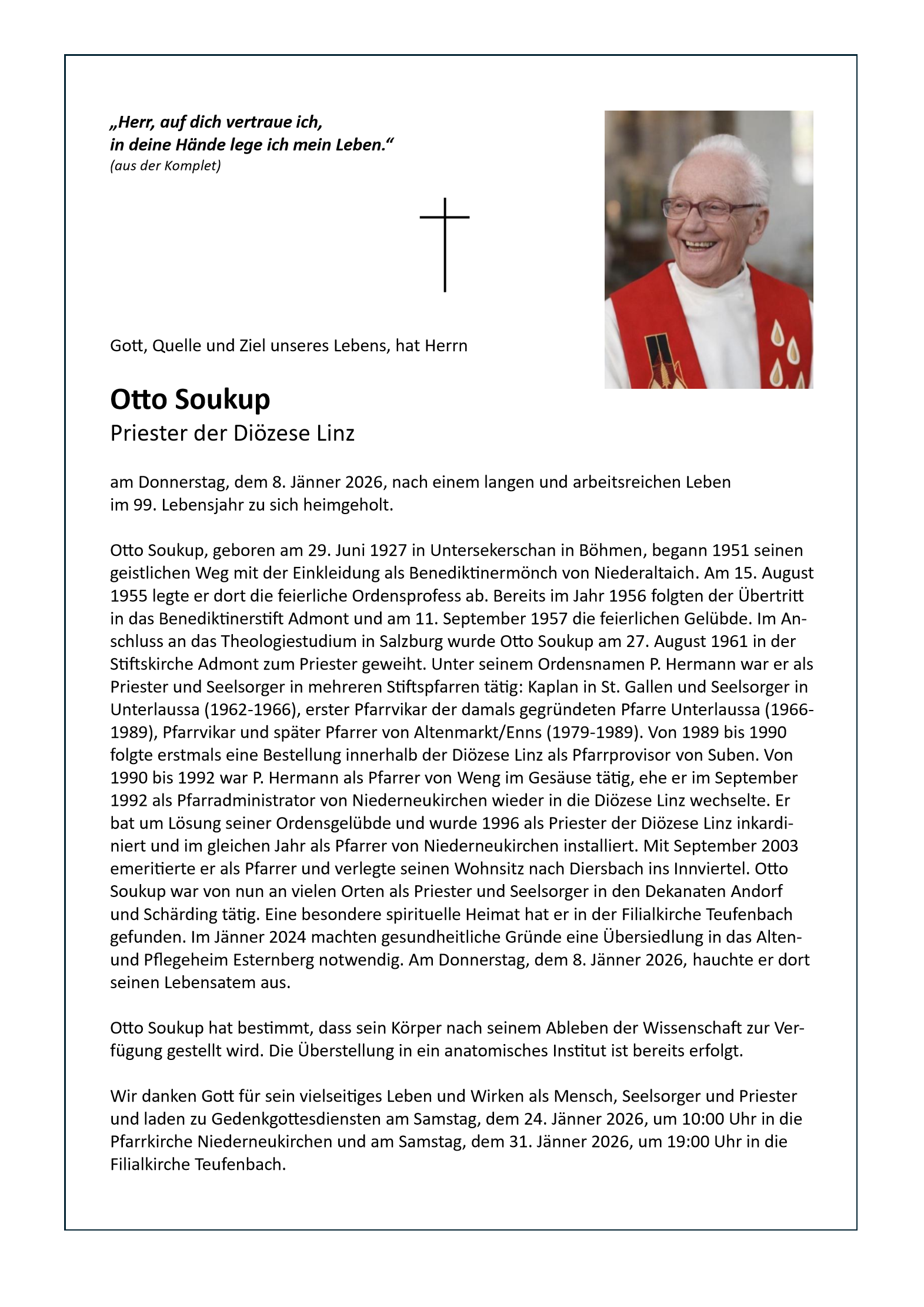 Otto Soukup war von 2011 bis 2018 die Urlaubsvertretung (Winterpfarrer) von Pfarrer Anthony Alamezie in der Pfarre Enzenkirchen.