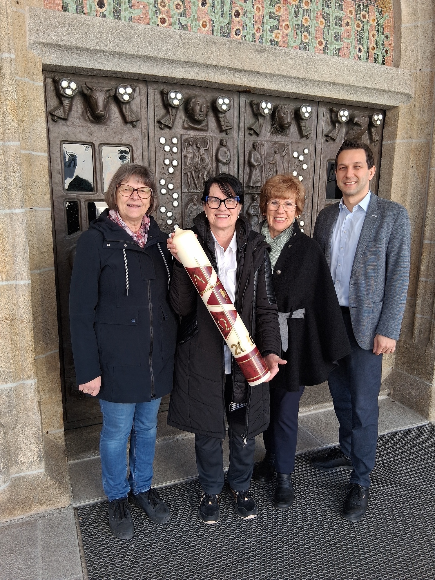 Osterkerze Während die Vorbereitungen für die Kar- und Osterliturgie auf Hochtouren laufen ist auch die neue Osterkerze eingetroffen.