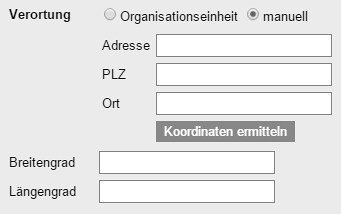 (b) Wählen Sie manuell (Bezeichnung: Name/Bezeichnung des Ortes, Straße, PLZ, Ort) und Klicken Sie auf "Koordinaten ermitteln"