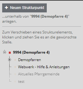 Sie können Strukturpunkte auf verschiedenen Ebenen erstellen. Die Funktionsweise eines Menüs gleicht einem Text mit Haupt- und Unterüberschriften. Wenn Sie eine Section auf der obersten Ebene erstellen wollen, klicken Sie auf das oberste Strukturelement (im Screenshot „9994 Demopfarre 4“), anschließend ganz oben links im Fenster auf den Button „+ Neuen Strukturpunkt“. Falls Sie eine Section in einem untergeordneten Menüpunkt (im Screenshot „Demopfarren“) anlegen wollen, dann klicken Sie erst auf diesen und dann wieder auf den Button.