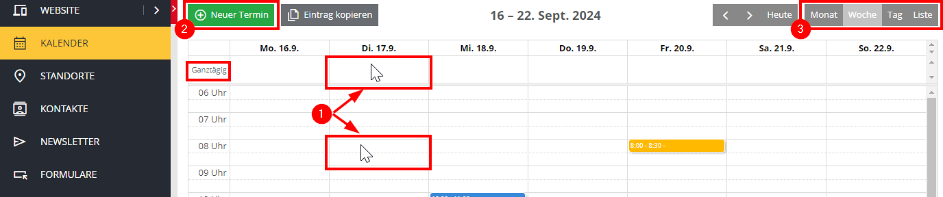 Klicken Sie im Kalender auf den entsprechenden ❶ Tag und die entsprechende Uhrzeit/auf Ganztägig (wird in der ❸ Wochen- und Tagesansicht angezeigt) oder verwenden Sie die Schaltfläche "+ neuer Termin" (❷)