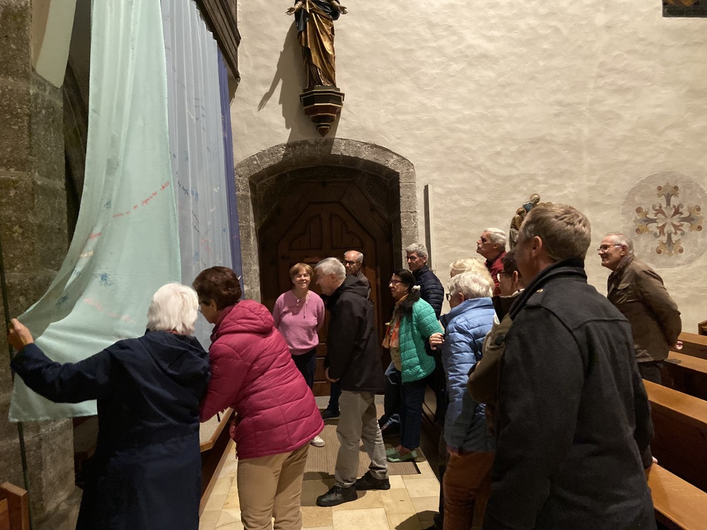 In Laakirchen präsentierte die Künstlerin Cécile Belmont das partizipative Kunstprojekt „NÄHER“ und gab spannende Einblicke in den Prozess und die Arbeitsschritte der letzen Monate. Stoffbahnen, die von der Künstlerin mit Aussagen von Laakirchnerinnen und Laakirchnern in deren Handschrift bedruckt wurden, hängen nun in der Pfarrkirche Laakirchen. Dem voraus gingen Schreibgespräche und Siebdruck-Werkstätten.