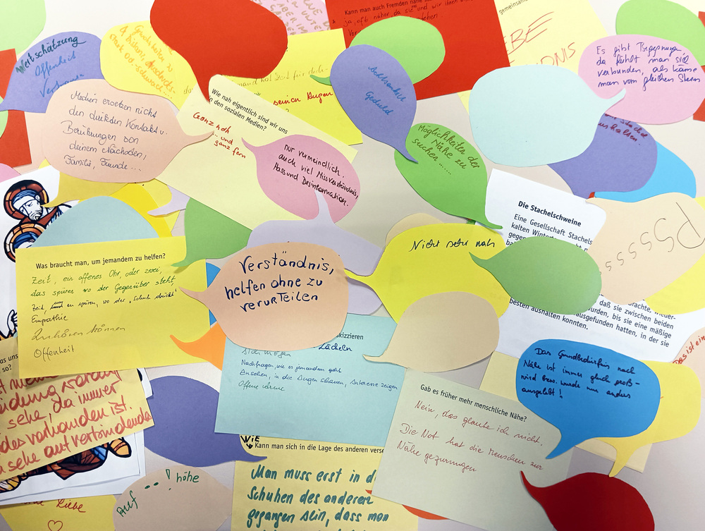 Bei verschiedensten Begegnungen steuerten Menschen Überlegungen und Sätze zu diesen Fragen bei. Es entstanden Schreibgespräche: beim Pfarrkaffee, mit BewohnerInnen im Seniorenheim, mit dem Bibliotheksteam sowie mit BesucherInnen des Wochenmarktes, eine Trauerbegleitungsgruppe, bei der Langen Nacht der Kirchen sowie beim Stadtfest.
