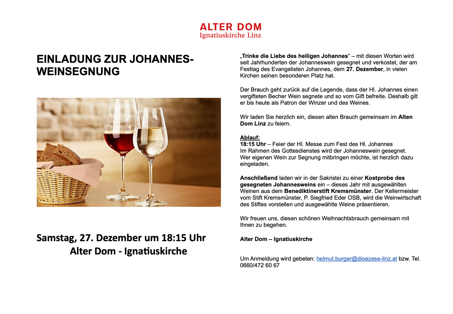 Sie erreichen uns telefonisch unter 0676 877 65 209 oder per Email ignatiuskirche@dioezese-linz.at