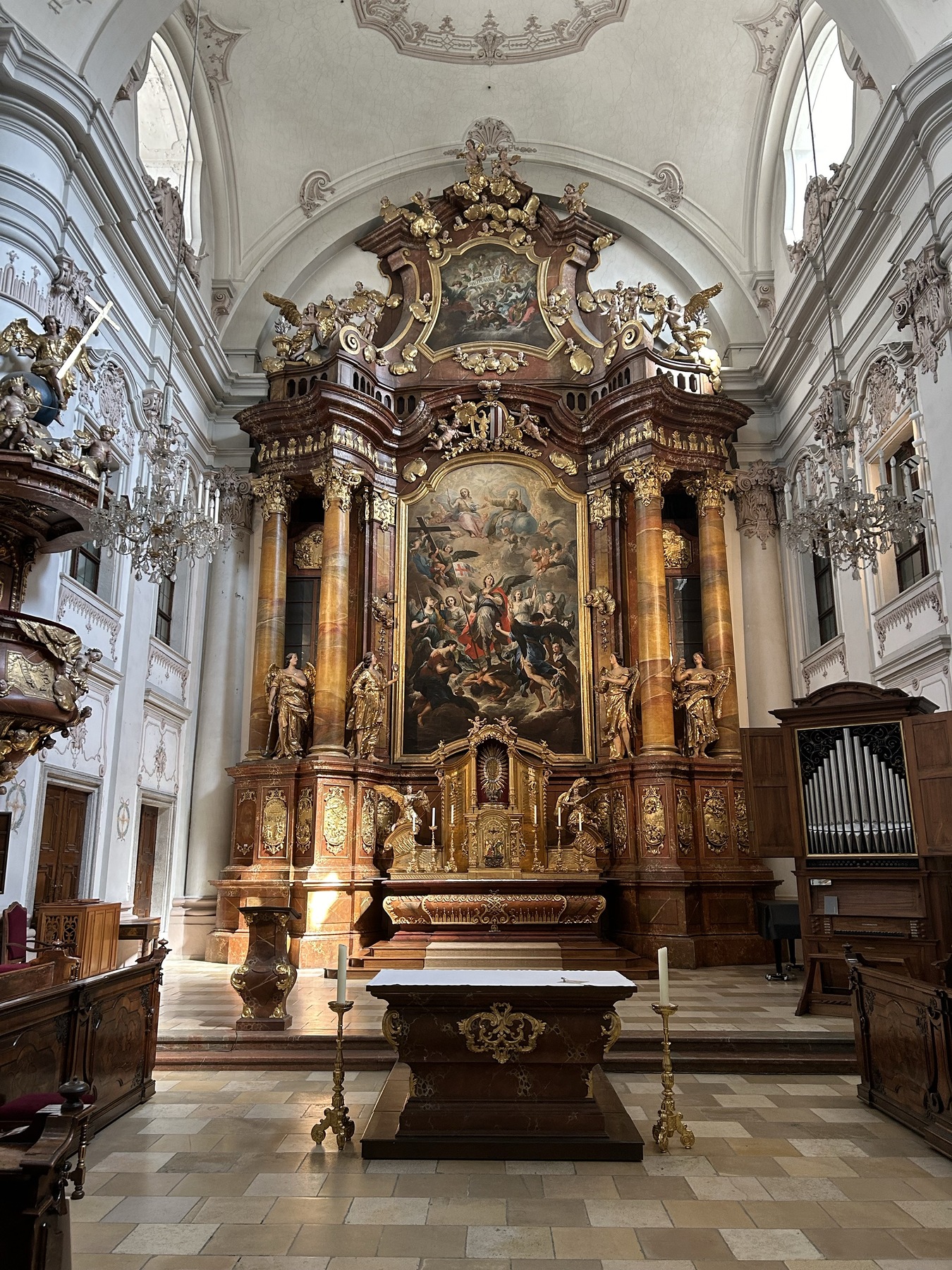 Zwischen den Säulen sind vier lebensgroße Engelsfiguren. Sie verkörpern die göttlichen Tugenden Hoffnung (Anker), Glaube (Kreuz) und Liebe (Herz) sowie die Tugend der Weisheit (Spiegel als Symbol für Selbsterkenntnis). Die 14 Reliefbilder am Altar zeigen Szenen mit Engelserzählungen aus dem Alten und Neuen Testament.