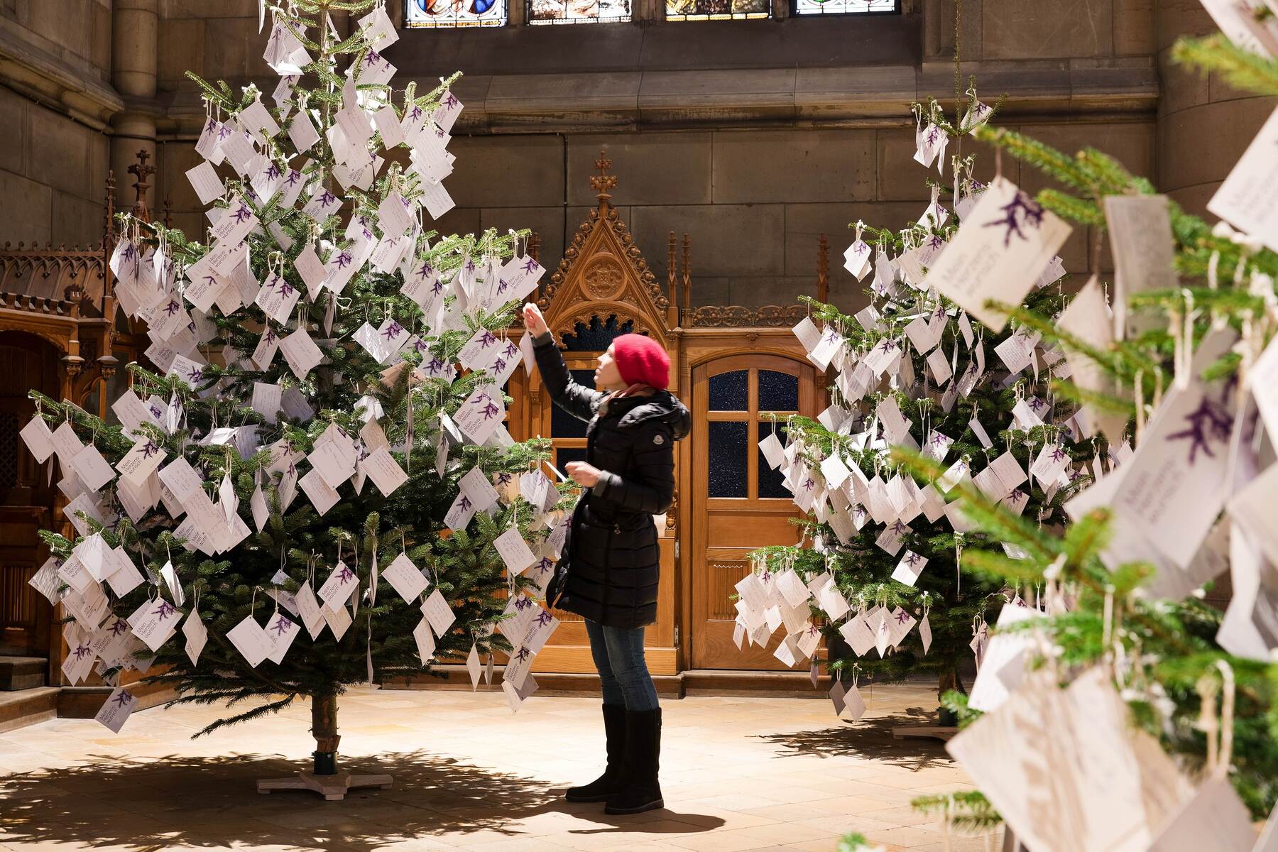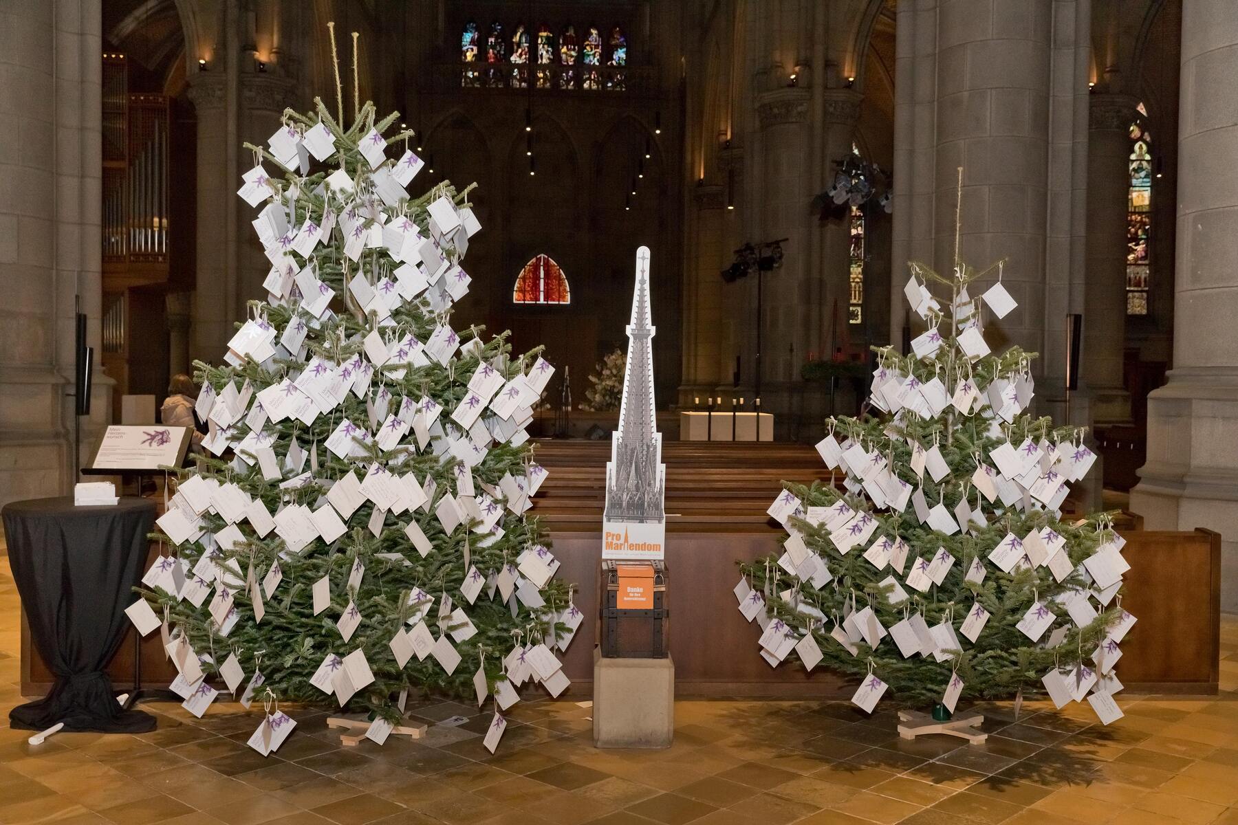 Von weitem wirkt es fast, als wären die Bäume mit Schnee bedeckt. Dabei sind es weiße Kärtchen, auf denen die Besucher:innen im Mariendom ihre Weihnachtswünsche schreiben. Die Wünsche sind vielfältig, etwa dass der Kater zurückkommt, die bevorstehende Operation gut verläuft, die Oma nicht mehr stürzt, die Prüfungen bestanden werden, die Familie gesund und beisammen ist oder dass es endlich schneit. Die Menschen sehnen sich aber auch allgemein nach Frieden auf der Welt, nach Stille, Zufriedenheit, Gesundheit.