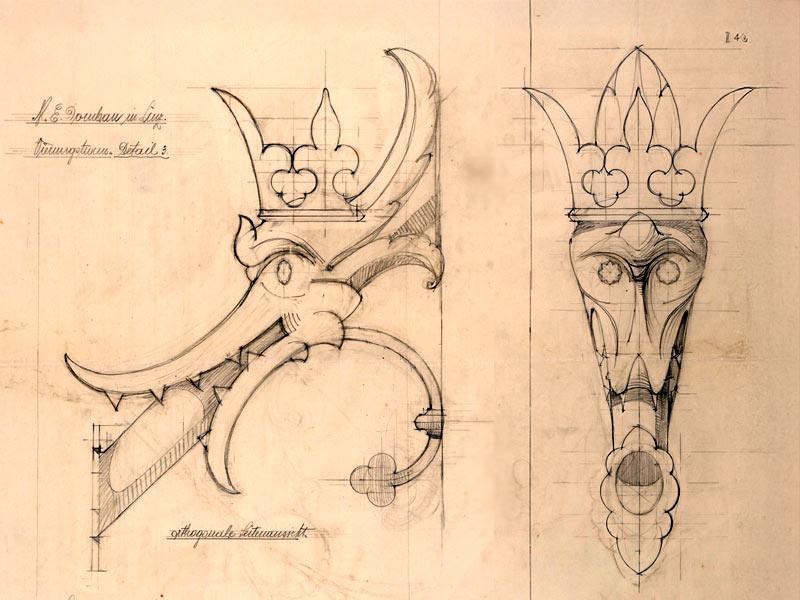 Auch die Architektur selbst spiegelt sich in den gesammelten Dokumenten wider. Detailreiche Baupläne und Konstruktionszeichnungen geben Einblick in die Planung und Umsetzung dieses monumentalen Bauwerks. Sie zeigen den Austausch zwischen Planenden, Handwerksschaffenden und Förder:innen, deren Vision den Bau und die Ausstattung des Doms prägte. Von besonderer Bedeutung sind auch die erhaltenen Glasfensterentwürfe, die heute als einziges Zeugnis für die im Zweiten Weltkrieg zerstörten Kapellenkranzfenster dienen.