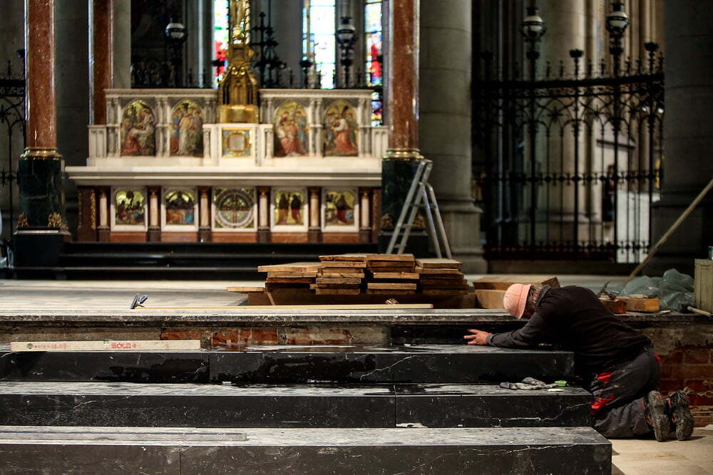 Das schwere Chorgestühl kommt wieder an seinen Platz.