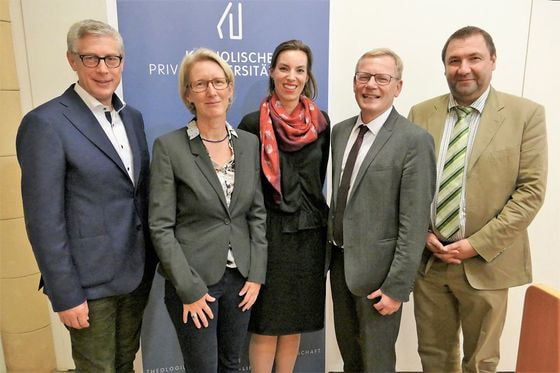 Die ReferentInnen (v. l.): Univ.-Prof. Dr. Ewald Volgger OT, Univ.-Prof.in Dr.in Anna Minta, Dr.in Maximiliane Buchner, Univ.-Prof. Dr. Christoph Niemand, Dr. Josef Keplinger. © KU Linz / Eder