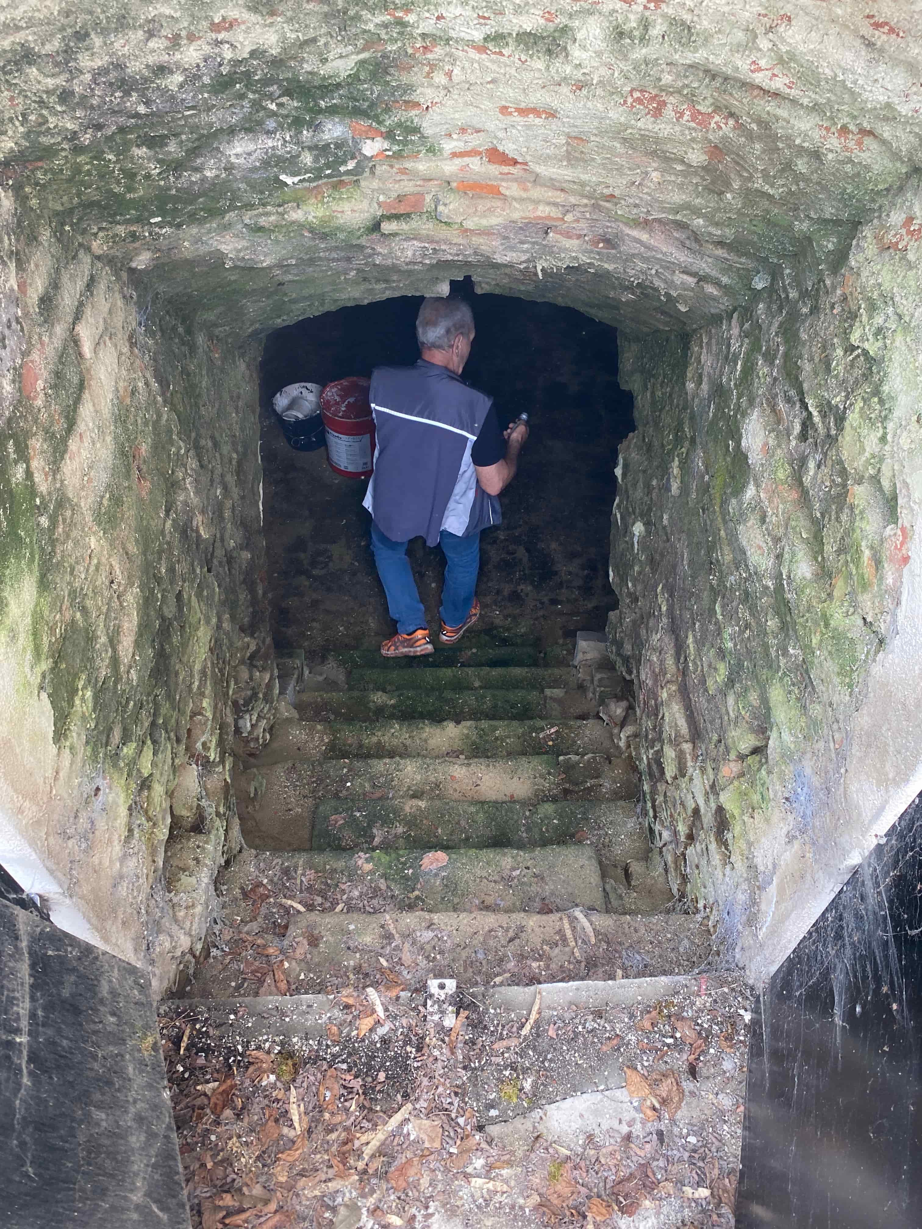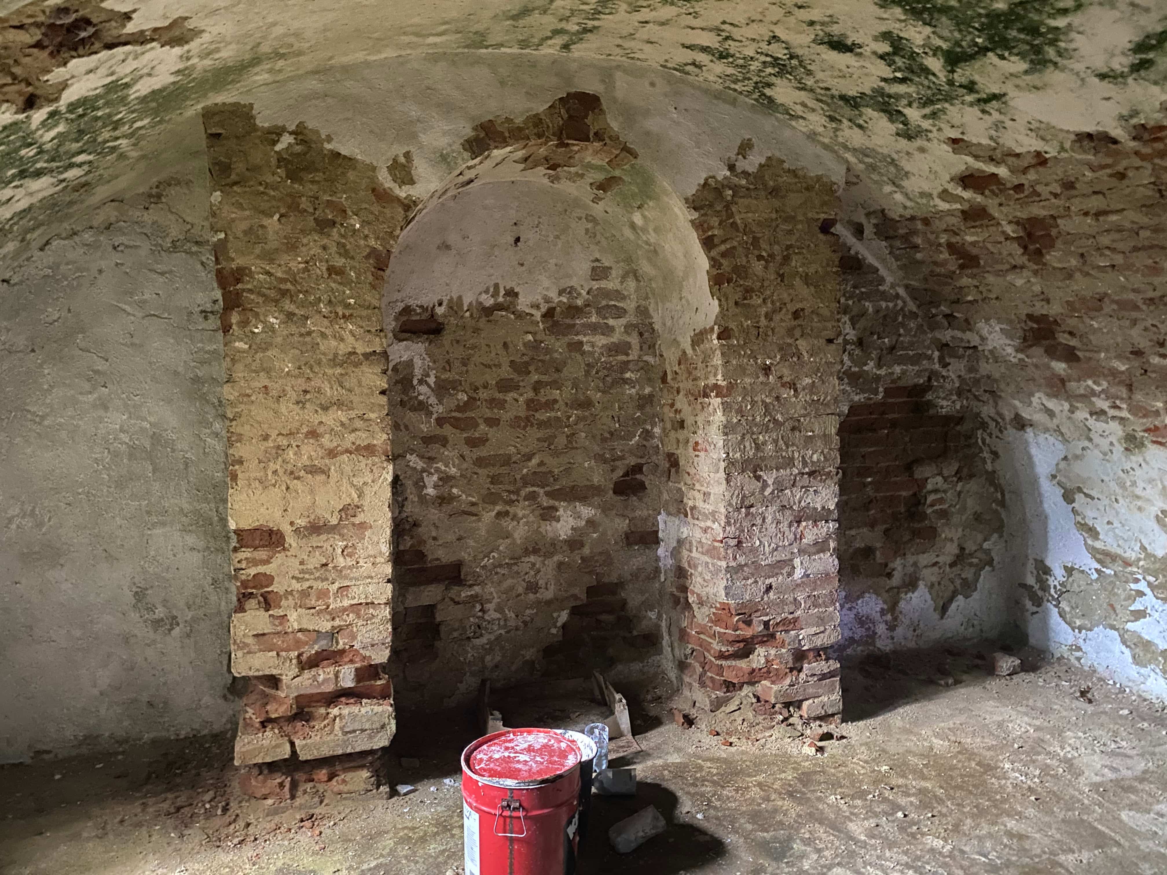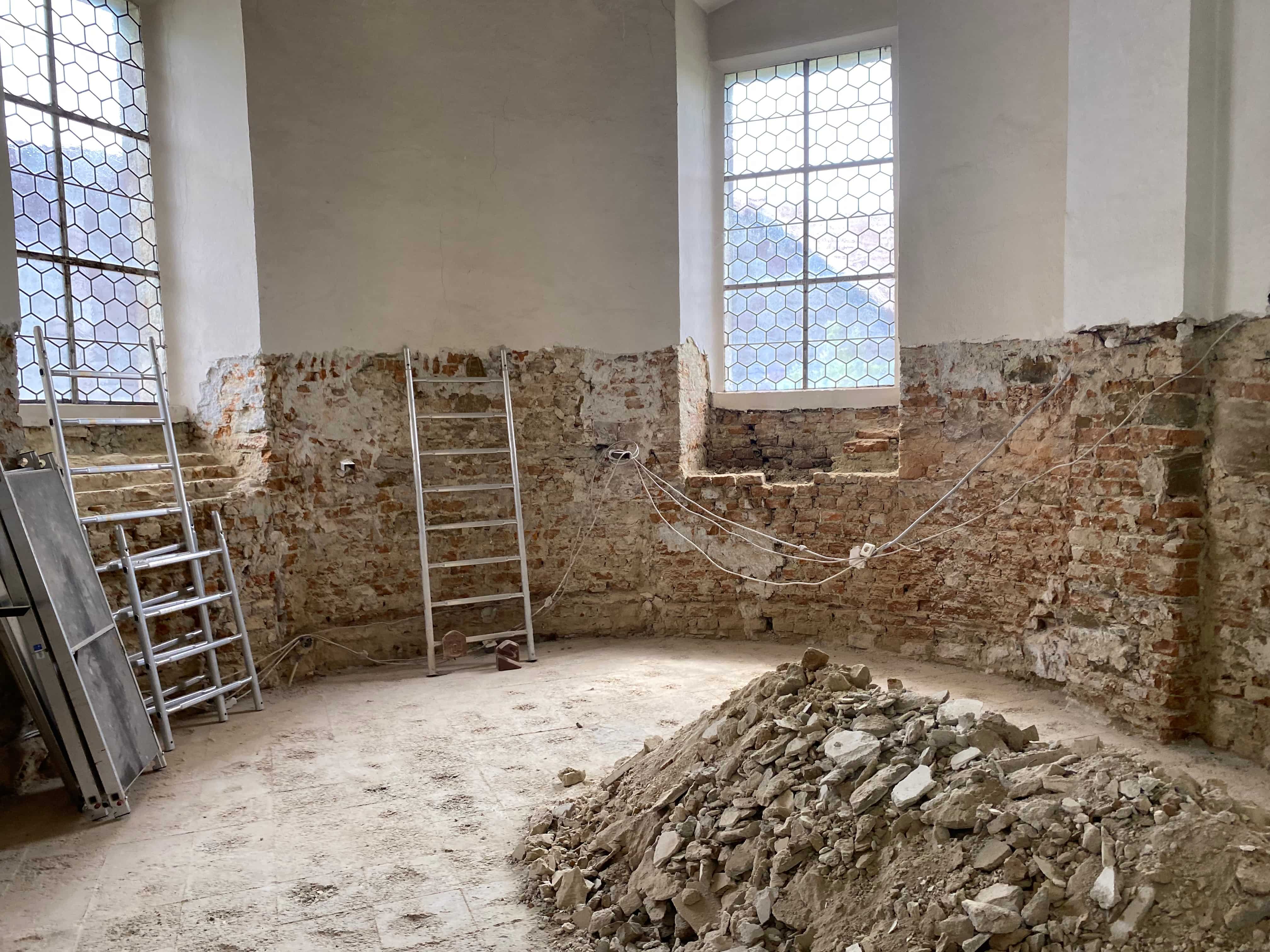 Die Kirche wurde ausgeräumt, die Bänke demontiert und zum Restaurator gebracht. In der Südkapelle wurde bereits im Juni der schadhafte Teil des Verputzes abgeschlagen und im Langhaus haben die Gerüstarbeiten