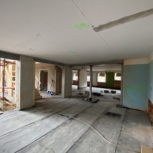Durch die gewählte Holzkonstruktions-Bauweise war der Rohbau bis Juli 2025 rasch errichtet, sodass mit dem Ausbau begonnen werden konnte. Das Dach ist großteils bereits eingedeckt. Im Untergeschoß wurden die neuen Maueröffnungen hergestellt, sodass auch hier die neuen Raumkonfigurationen schon gut erkennbar sind.