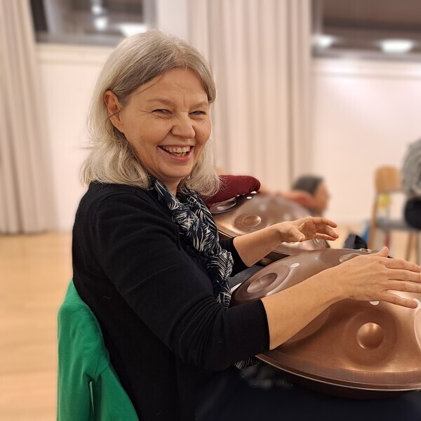 Das Foto zeigt sie beim Referent:innen‑Studientag im Jänner dieses Jahres im Schloss Puchberg, wo sie mit großer Freude an einem Handpan‑Workshop teilgenommen hat.