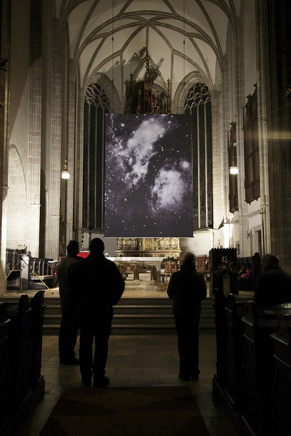 Caroline Heider führt mit ihrem Fastentuch die Tradition der Himmelsbilder in der für ihre künstlerische Arbeit charakteristischen Herangehensweise – der Verwendung und Transformation eines bestehenden Bildes – weiter. Der Künstlerin geht es dabei weniger um das Abgebildete, sondern vielmehr darum, bei den Betrachtenden – auch im Sinne des Verständnisses der Fastenzeit als Zeit der Rückbesinnung und inneren Einkehr – innere Bilder zu erzeugen.