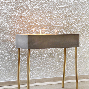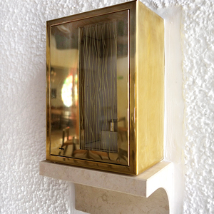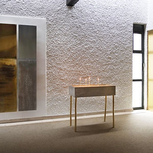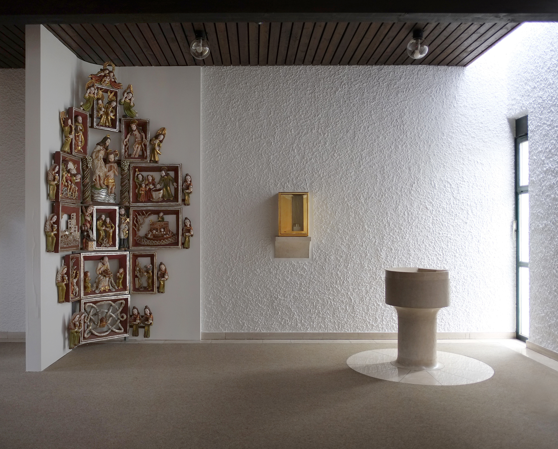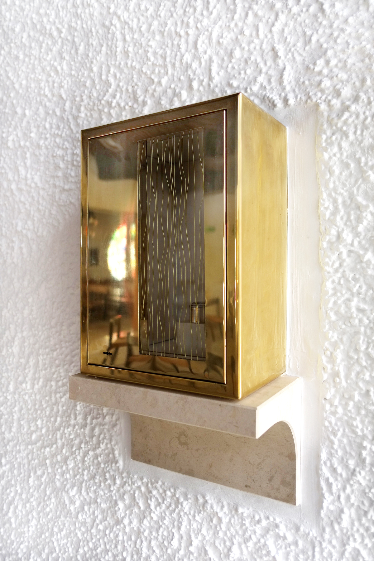 Der Tabernakel wurde in das Behältnis für die Heiligen Öle umfunktioniert und in der Nähe des Taufbeckens platziert. Die Türe mit den von der Künstlerin eingearbeiteten Messingfäden korrespondiert mit der gegenüberliegenden Eingangstüre. Dort wurde eine kleine Öffnung mit Glas und Messingfäden angebracht. Zum bestehenden Ensemble passend wurden von der Künstlerin ein Lesepult und zwei Tische entworfen und in geräucherter Eiche ausgeführt. Judith Fegerl ist mit ihrem künstlerischen Konzept ein atmosphärischer Raum gelungen, der behutsam mit dem Bestand umgeht und neue Akzente schafft.