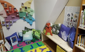 Ein:e Bibliotheksmitarbeiter:in hat die Zeit während des Lock-Downs genutzt und ein Regal im Sinne der Dachmarke mit ihrem Mann für die Präsentation und Aufbewahrung der Tonies gebaut.