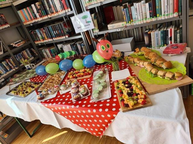 Die lange Nacht begann für manche in der Bibliothek Grünau schon am Nachmittag, als zahlreiche Kinder in Begleitung ihrer Eltern, Großeltern oder Tanten, Onkeln zum „Frühlingsfest mit der Raupe Nimmersatt“ eintrafen. Auf den zahlreichen Stationen zwischen Bücherei und Spielplatz wurde gemalt und gebastelt, gelesen und erzählt, eine Geschicklichkeitsrallye und Zielwerfen waren zu absolvieren, Spiele und Rätsel raten und als letzte Station und zur Erinnerung konnte ein Schmetterlingsbild geknipst werden. Als krönenden Abschluss wartete ein umfangreiches, buntes Raupenbuffet auf die Besucher:innen.