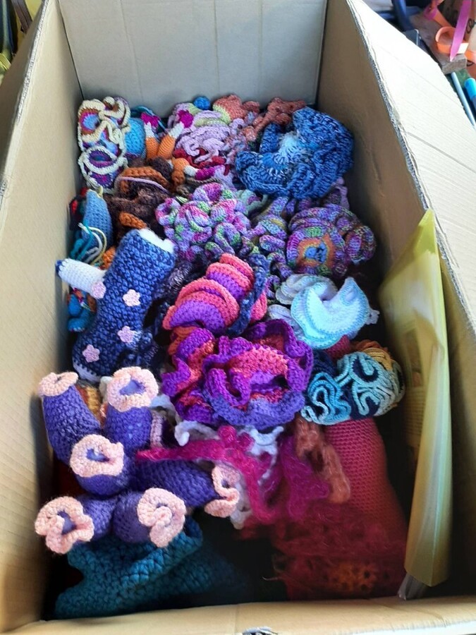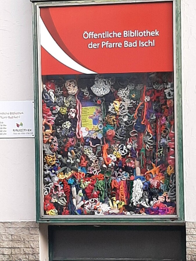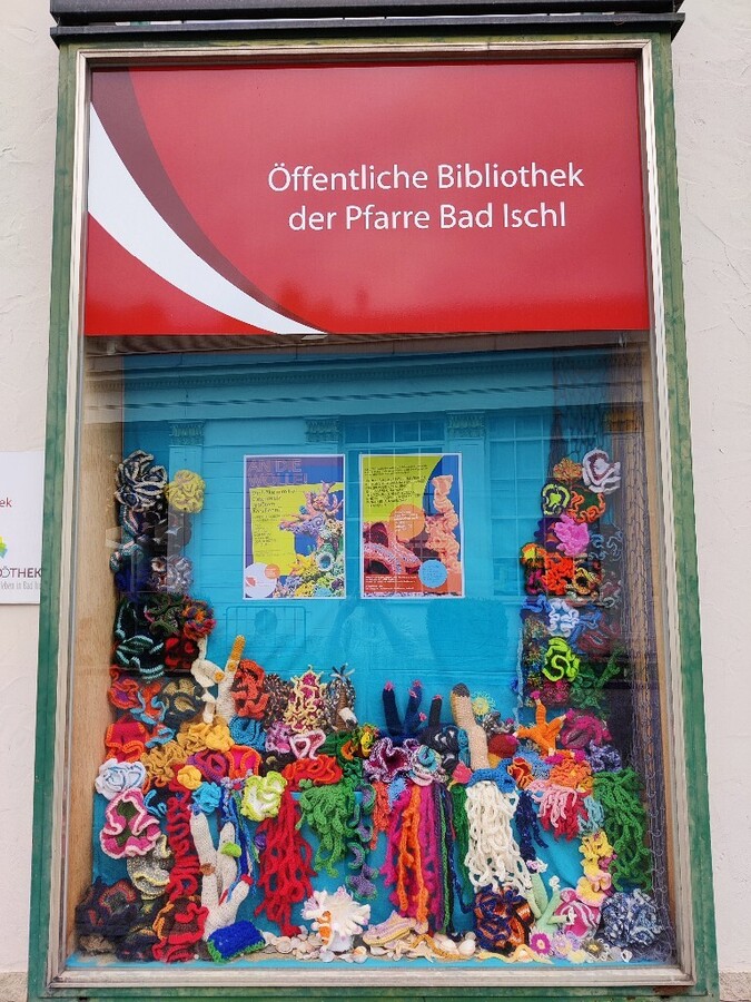 Alle Häkelfans waren herzlich eingeladen, an der Entstehung des größten Korallenriffs Österreichs mitzuarbeiten und und das globale Riffnetzwerk aus Wolle weiterzuentwickeln. Das ließ sich die Bibliothek Bad Ischl nicht zwei Mal sagen: Das Korallenriff im Schaufenster wuchs uns wuchs... Im September wurden dann zwei große Kartons voller Korallen ins Schlossmuseum in Linz gebracht.