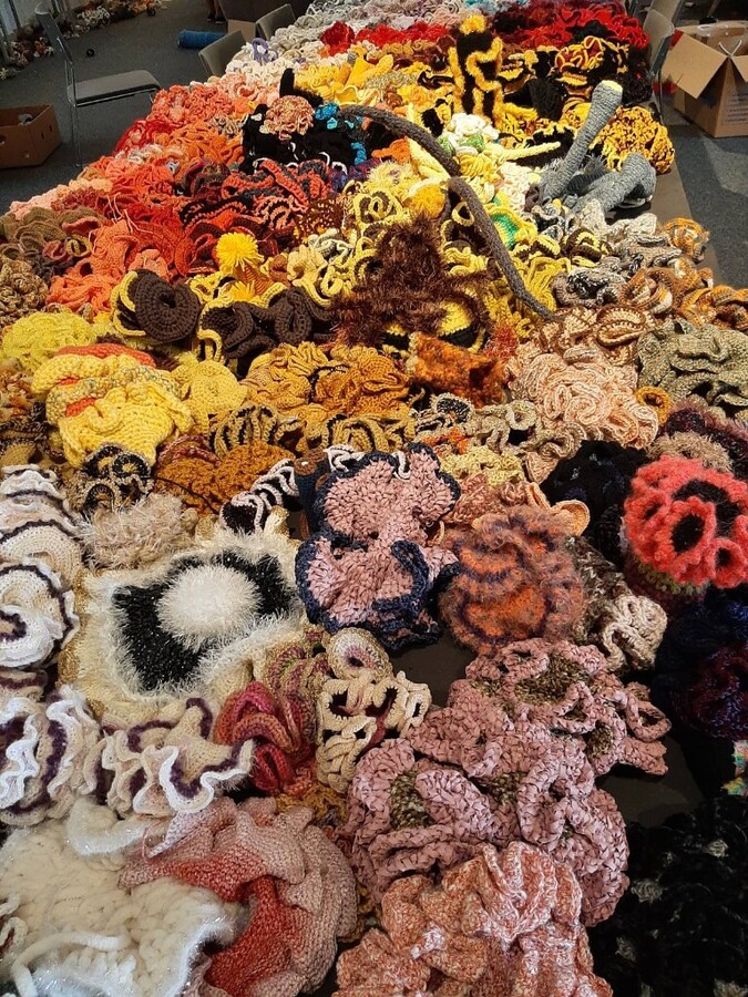 Korallenriffe begeistern mit ihren leuchtenden Farben Menschen weltweit. Der Klimawandel führt aber zum Verschwinden der beeindruckenden Ökosysteme. Um darauf aufmerksam zu machen, starteten die in den USA lebenden Künstlerinnen in Kooperation mit dem Institute For Figuring ihr Projekt "Crochet Coral Reef": Gemeinsam mit der Bevölkerung häkelten sie in einem kollaborativen Prozess Korallenriffe.