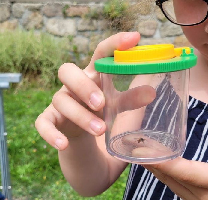 Zum Abschluss konnten die Kinder den Garten der Pfarre nach kleinen Lebewesen durchstöbern und diese dann mit Becherlupen genau beobachten.