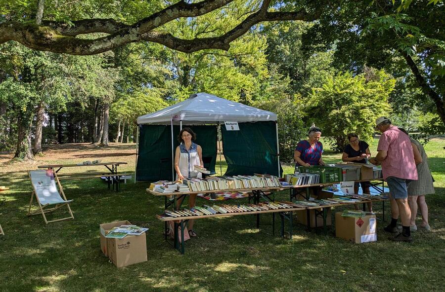 Bei strahlendem Sommerwetter konnten die Besucher:innen am schattigen Bibliotheksstand die Flohmarkttische durchstöbern und auf Liegestühlen und Picknickdecken verweilen. Unter fachkundiger Beratung fanden zahlreiche Bücher, Zeitschriften, Hörbücher und DVDs ein neues Zuhause.