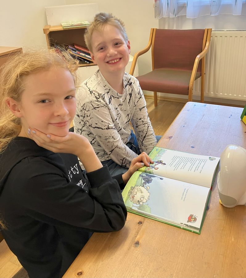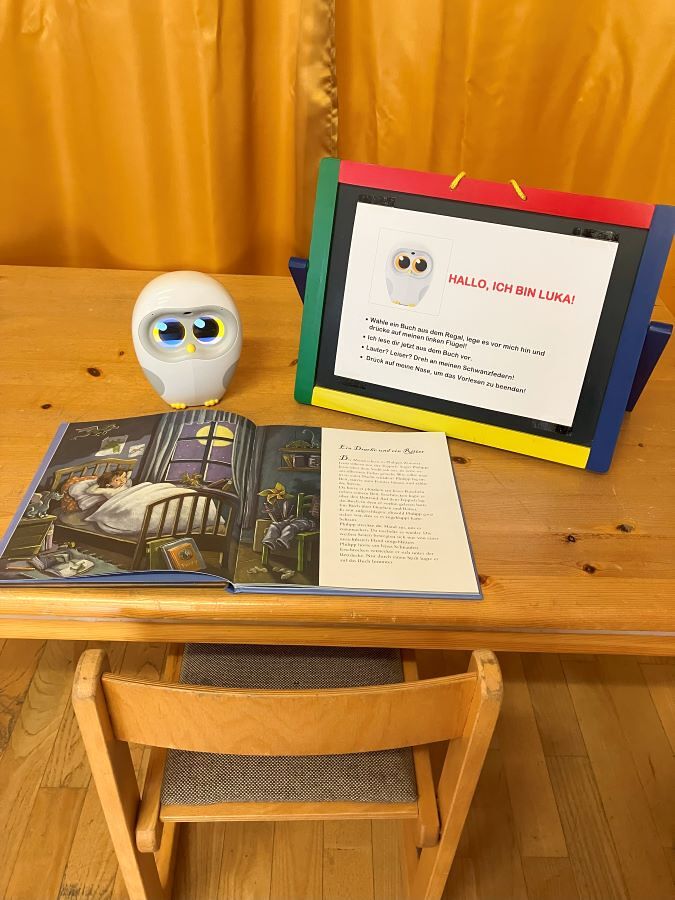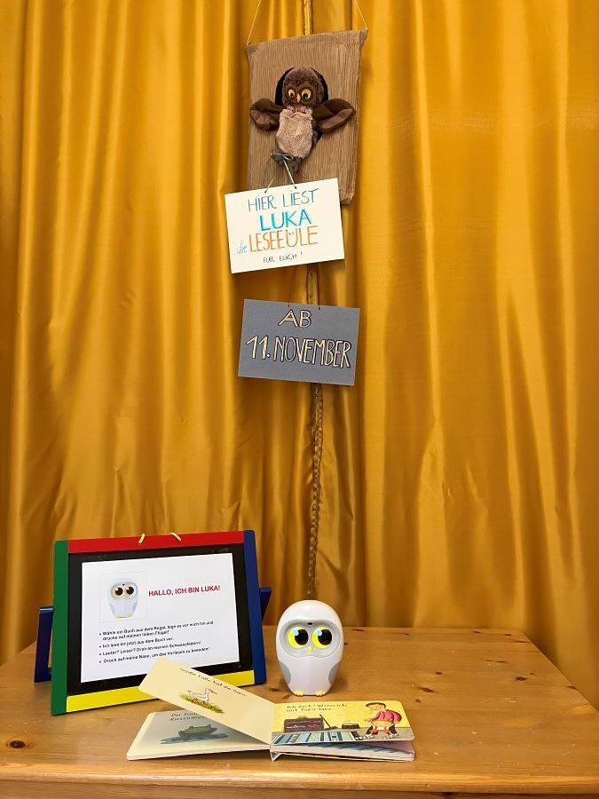 LUKA las den Kindern während der Öffnungszeiten der Bücherei in einer gemütlich eingerichteten Leseecke spannende Geschichten vor. Die Kinder konnten sich aus 14 Büchern eines aussuchen, es vor die Eule legen, aufschlagen und schon ging es los.
